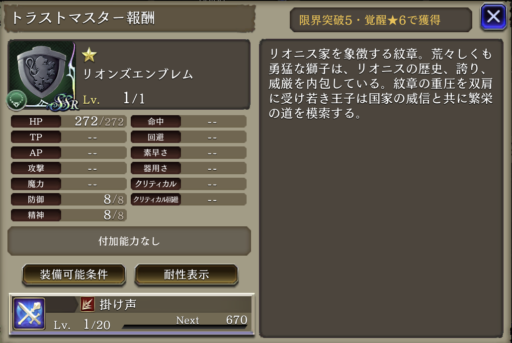ナイトの心得 | HP上限+15%、斬撃攻撃貫通率+40 |