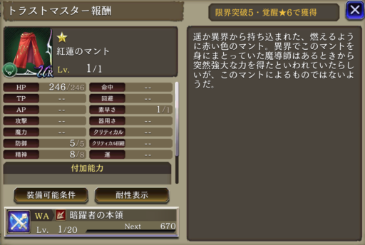 魔法攻撃力アップ ↓ 魔法攻撃力アップⅡ | 魔力+12%、精神貫通率+40 ↓ 魔力+12%、精神貫通率+40、範囲攻撃耐性貫通率+40 |
