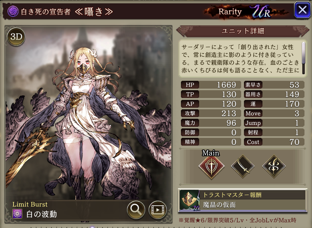 | ⇩MA3強化⇩ 味方の闇属性ユニットのHP上限+10%・闇属性アビリティ攻撃+15 自身の全攻撃タイプ耐性弱体耐性+100、ヘイトアップ+5、斬撃攻撃力+5、全攻撃タイプ耐性+5 |
