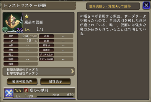 ナイトの心得 | HP上限+15%、斬撃攻撃貫通率+40 |