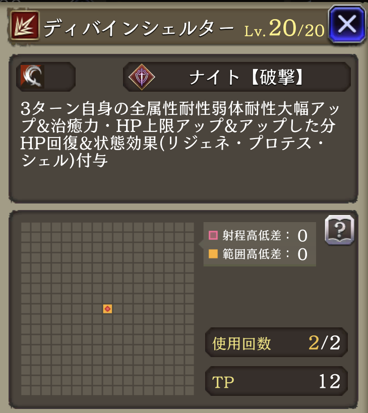 | ①「ディバインヒール」 使用回数+1、エリアデバフ追加 斬撃・刺突・打撃・射撃・魔法貫通50ダウン ②「プロテクトブレイク」 必中に |