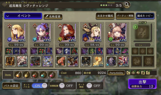 (参考例)こんなパーティでオート周回しました。手持ちでレインや火属性ユニット、範囲攻撃ユニットがいなかった為、あまり適正ではないです。
