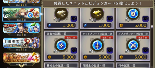 ![]() ▲こちらの「ピックアップショップ」では ![]() ▲JobLv素材(記憶系)や ![]() ▲ユニット覚醒素材がギル購入できるので 忘れずに購入したい |