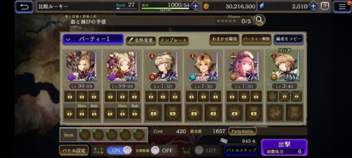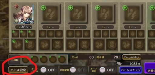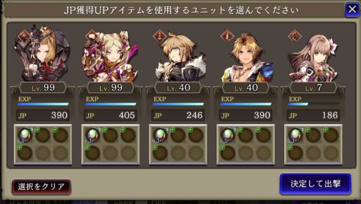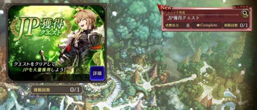 ![]() 「キークエスト」の「JP獲得クエスト」を開放 ![]() ![]() 出撃前に「バトル設定」でJP獲得UPアイテム使用 「ON」に ![]() オーパル(極) を持ち込み ![]() これで1回あたり5000JPくらい稼げる |