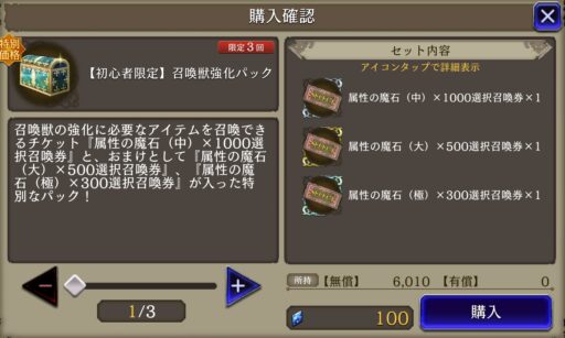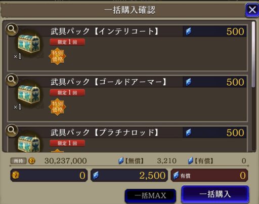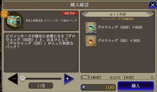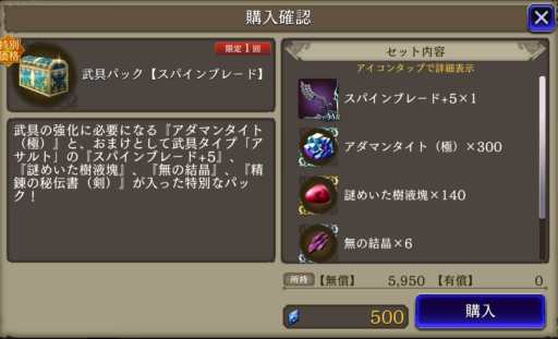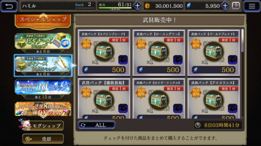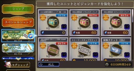 もう一つのビギナーズショップには武具も売っている⇩ ![]() ![]() ▲全て+5という最大強化済みの状態で買うことが出来る (覚醒と強化用の素材も付いている) 販売しているSSR武具は、通常プレイだと 序盤では1か月かかっても作るのは難しいほど 高難度クエスト周回を必要とするので、 1つでも多く買うことをオススメする |