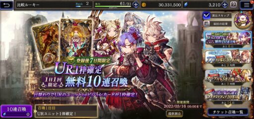 ![]() ▲今引ける残りのガチャも引いておく (こちらは3/24まで、まとめて100連ガチャ可能!) ![]() ▲7日間毎日UR1枠確定のおいしい無料ガチャ |