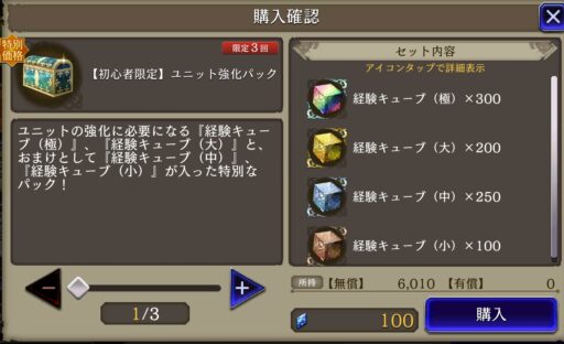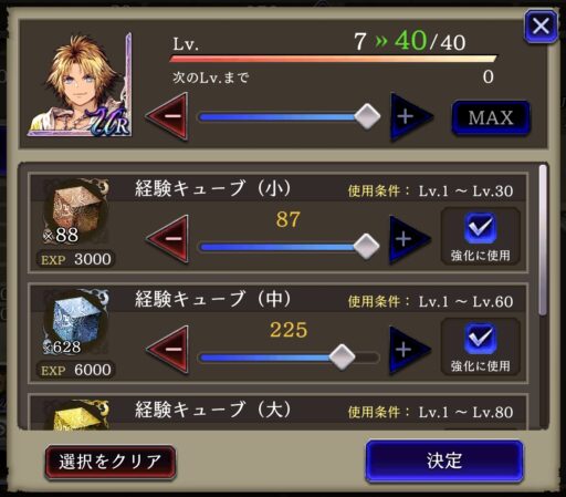 ストーリーを進めたら 「ユニットLv強化」 「ユニット覚醒&JobLv強化」 「ユニットアビリティボード開放」 「召喚獣強化」 「武具強化」 など行っていく ![]() ▲Lvは経験キューブで一気に上げられる 覚醒素材について ⇩ 詳しくはこちら まず一番は主力Lv99キャラ(今回はヘレナ)の JobLv強化がおすすめ ※アビリティボード開放の為 不足する素材に関しては ⇩ ![]() ▲ビギナーズショップで買ったチケットで入手可能 |