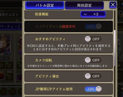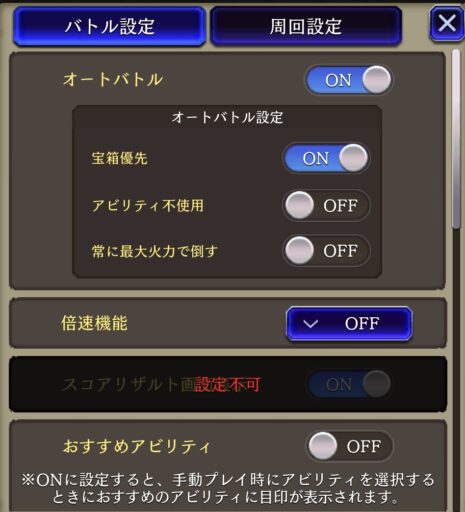 ![]() クエスト突入前の編成画面左下 【バトル設定】 ![]() ![]() 【倍速機能】で×1.5を選択 これでオートが1.5倍速に |