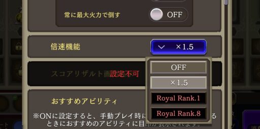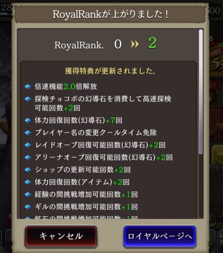 1章1節Battle10クリアまでクリアすると 【2倍速でプレイ】できるように ![]() ▲クリア後にレコードミッションを 確認・受け取ると⇩ ![]() ロイヤルランクがアップ! 「倍速機能2.0倍開放」 |