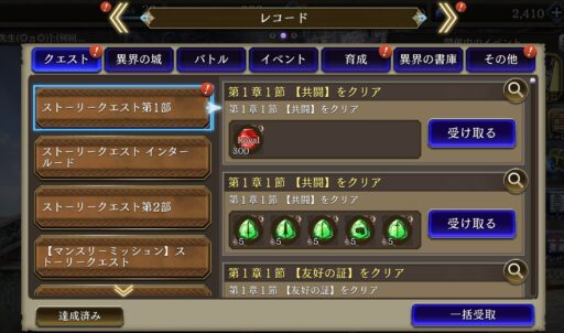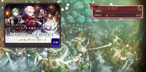 | 【ここまで140分くらい】 (今のところ強化や育成など全くいらない) そのままアナザーストーリー1章 「飲み込まれたクリスタル1」までクリア ※難しいが公式同行者を連れていくと楽 ⇩ ルシオが限界突破3回まで可能 ⇩ それぞれのクエストを3回ずつクリアすると レコードミッション報酬で覚醒素材が入手可能 |