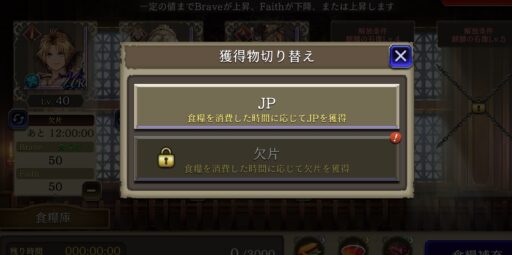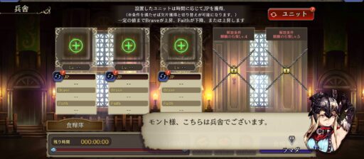 【兵舎】が利用できる![]() ![]() ユニットをセットして「欠片」を選択すると、 時間経過で限界突破のための欠片が手に入る ※貴重な欠片入手手段 ![]() またブレイブやフェイスを上げることも可能 (最大70) |