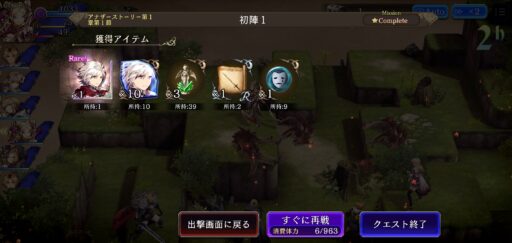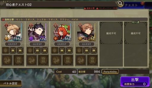 | 【ここまで100分くらい】 (今のところ強化や育成など全くいらない) ⇩ 2倍速に設定後 1章2節Battle10までクリア 【キャラクタークエスト】がプレイ可能に ※ストーリーが進まないと開放されないユニットも |