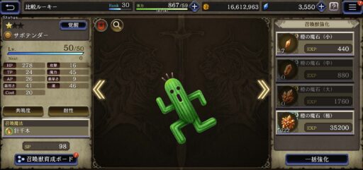 【召喚獣】![]() 有力なUR召喚獣がいない場合 魔法系は「サボテンダー」「セイレーン」がおすすめ ![]() ▲強化素材はビギナーズショップで買ったチケットで入手可能 |