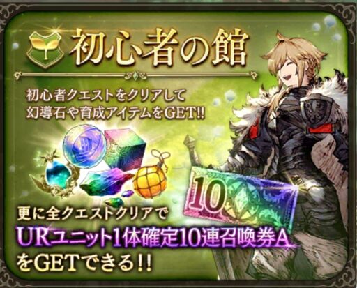 | 【ここまで20分くらい】 「初心者の館」全14クエストをプレイ (所要時間20~30分) ※手動が面倒な方は後回しでもOK ⇩ 幻導石1400と育成素材、 URユニット1体確定10連ガチャチケット×2などを入手 |