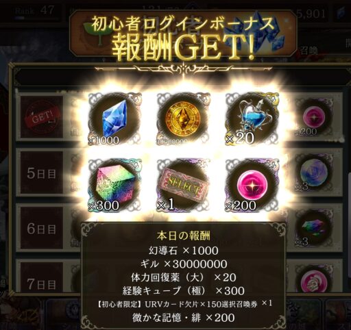 ![]() ▲ログインボーナスでは7日間で 「ユニット欠片200×3」や「VCの欠片150×2」がもらえる! |