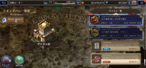 ▲ ストーリー➜ワールドクエスト➜「リオニス城」などの場所をタップ➜クエスト一覧の一番下にサブクエがある