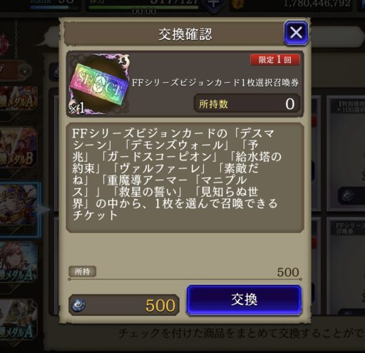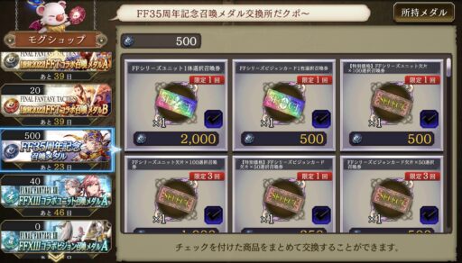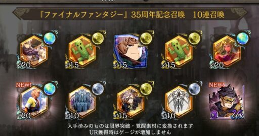 ![]() ▲目玉のFF35周年記念ガチャを 「ビジョンカード選択券」目的で50連回す (おこぼれの副産物FFコラボ狙いでもあるw) ![]() 副産物で破滅シュテルをget 残念ながらFFコラボ系は出ず… ![]() ▲他にめぼしいものは当たらず、たまったメダルで選択召喚券をget ![]() この券で「ヴァルファーレ」を選択 ![]() ▲光パのソロクエストで重要な役割を持つ召喚獣「ヴァルファーレ」を入手 光耐性大幅ダウン効果のある召喚魔法を使える (ほかにはカーバンクルのみでオートで使ってくれないため貴重) |