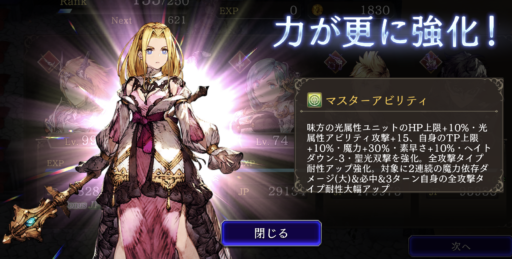 ![]() TP上限+10%、素早さ+10% ⇩ ⇩ 味方の光属性ユニットのHP上限+10%・光属性アビリティ攻撃+15、自身のTP上限+10%、素早さ+10%、魔力+30%、ヘイトダウン3、LBを強化(3ターン耐性+60に強化、魔力依存攻撃&必中に) |