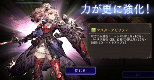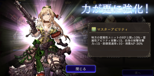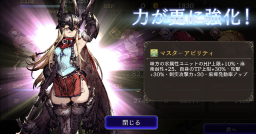 TP上限+30%、刺突攻撃力+20 ⇩ ⇩ 味方の水属性ユニットのHP上限+10%・麻痺耐性+25、TP上限+30%、刺突攻撃力+20、攻撃+30%、麻痺発動率アップ ![]() |