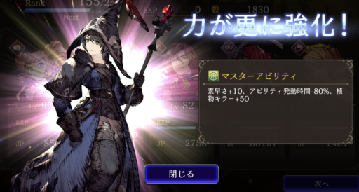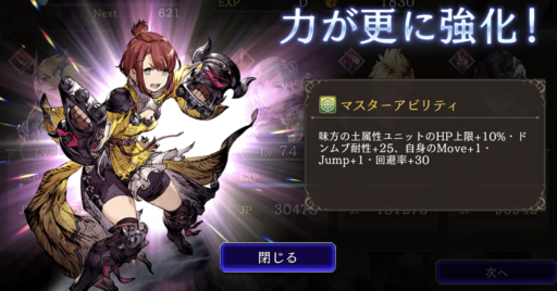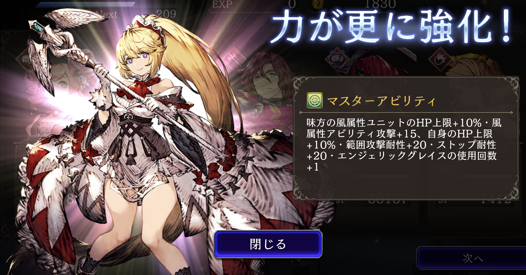 HP上限+10%、ストップ耐性+20 ⇩ ⇩ 味方の風属性ユニットのHP上限+10%・風属性アビリティ攻撃+15、自身の範囲攻撃耐性+20、HP上限+10%、ストップ耐性+20、LB使用回数+1 ![]() |