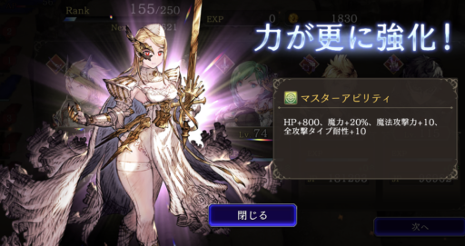 | サポアビ無し HP5015➜5350 防御10➜20 サポアビあり HP5921➜6250 防御22➜32 |