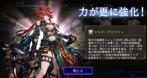 ![]() クリティカルダメージ+15%、命中率+10 ⇩ ⇩ 味方の風属性ユニットのHP上限+10%・風属性アビリティ攻撃+15、自身の 防御貫通+40、クリティカルダメージ+15%、命中+10、飛びつき大斬斧を強化(単体耐性ダウン効果がダメージ前に発動&ガッツ効果が追加) |