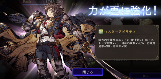 ![]() 素早さ+10%、氷属性耐性+10 ⇩ ⇩ 味方の火属性ユニットのHP上限+10%・火属性アビリティ攻撃+15、自身の防御貫通率+30、斬撃・魔法耐性+10、素早さ+10%、氷属性耐性+10 |