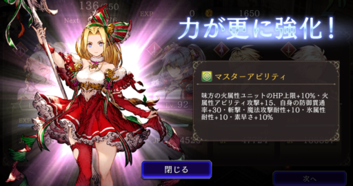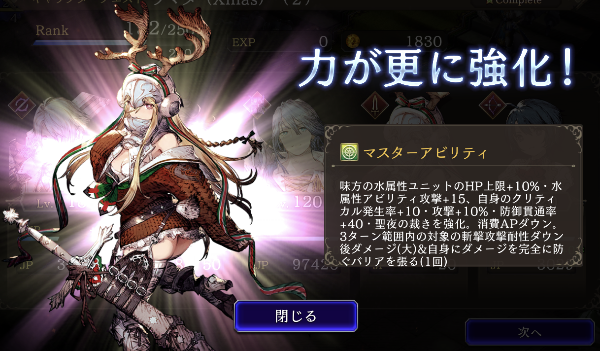 ![]() クリティカル発生率+10、攻撃+10% ⇩ ⇩ 味方の水属性ユニットのHP上限+10%・水属性アビリティ攻撃+15、自身のクリティカル発生率+10、攻撃+10%、防御貫通率+40、(聖夜の裁きを強化:消費APダウン、3ターン範囲内の対象の斬撃耐性ダウン後ダメージ(大)&自身に完全ダメージバリア(1回) |