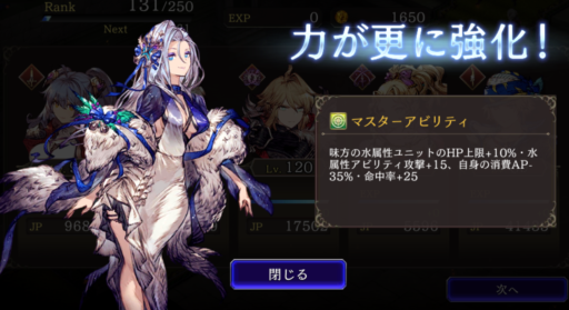 ![]() 味方の水属性ユニットのHP上限+10%・水属性アビリティ攻撃+15、自身の消費AP-20% ⇩ ⇩ 味方の水属性ユニットのHP上限+10%・水属性アビリティ攻撃+15、自身の消費AP-35%、命中率+25 |
