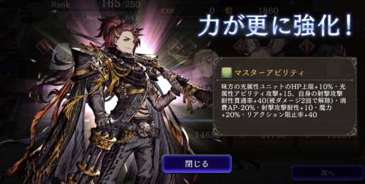 ![]() 味方の光属性ユニットのHP上限+10%・光属性アビリティ攻撃+15、自身の消費AP-20%・射撃耐性+10 ⇩ ⇩ 味方の光属性ユニットのHP上限+10%・光属性アビリティ攻撃+15、自身の消費AP-20%・射撃耐性+10、射撃耐性貫通+40(被ダメージ2回で解除)、魔力+20%、リアクション阻止率+40 |