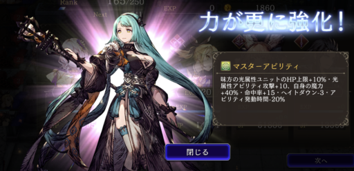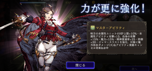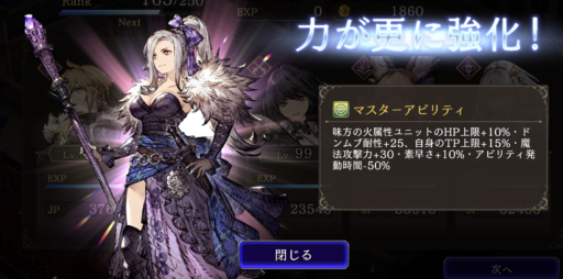 ![]() 味方の光属性ユニットのHP上限+10%・光属性アビリティ攻撃+15、自身の魔力+20%・命中率+15 ⇩ 味方の光属性ユニットのHP上限+10%・光属性アビリティ攻撃+15、自身の魔力+40%・命中率+15、ヘイトダウン3、アビリティ発動時間-20 |