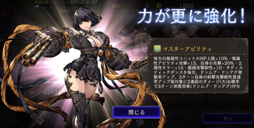 ![]() 攻撃+10%、土属性キラー+15 ⇩ ⇩ 味方の風属性ユニットのHP上限+10%・風属性アビリティ攻撃+15、自身の攻撃+20%、土属性キラー+15、範囲攻撃耐性+10、LBを強化(3ターン射撃耐性貫通率アップ追加&ドンムブ・ドンアク効果付与率アップ) |