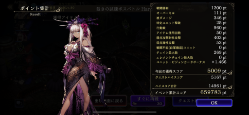 各クエストにはハイスコアが設定されているので、ボーナス大以上のユニットを編成したり、少行動回数、チェイン数、オーバーキルなどでポイントを稼ぎます。