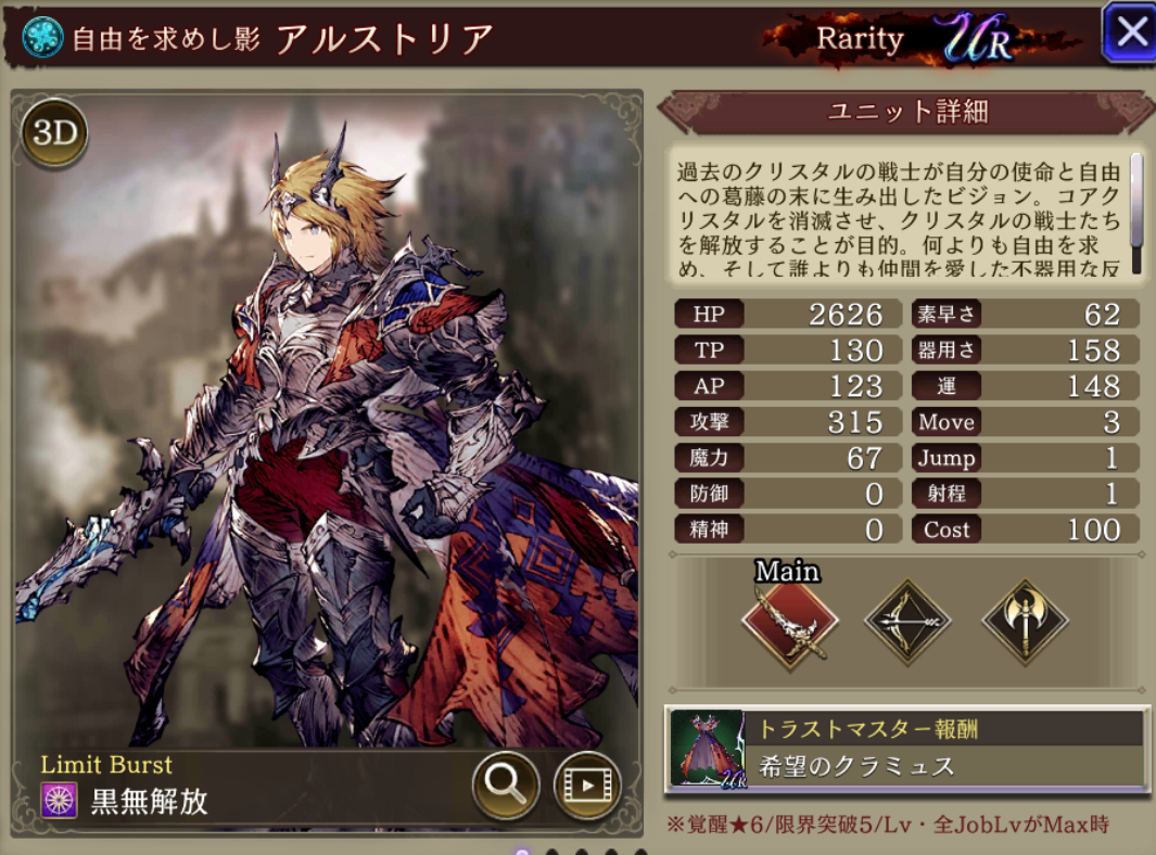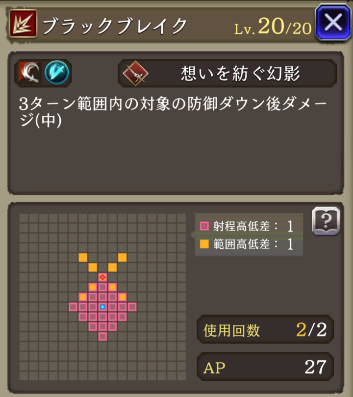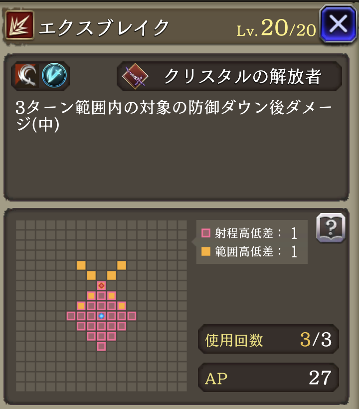 | 付加効果 | 命中+15 斬撃攻撃耐性+15 エクスブレイク 強化 使用回数+1 斬撃攻撃耐性貫通率アップ 自身のCTアップ(小)追加 |