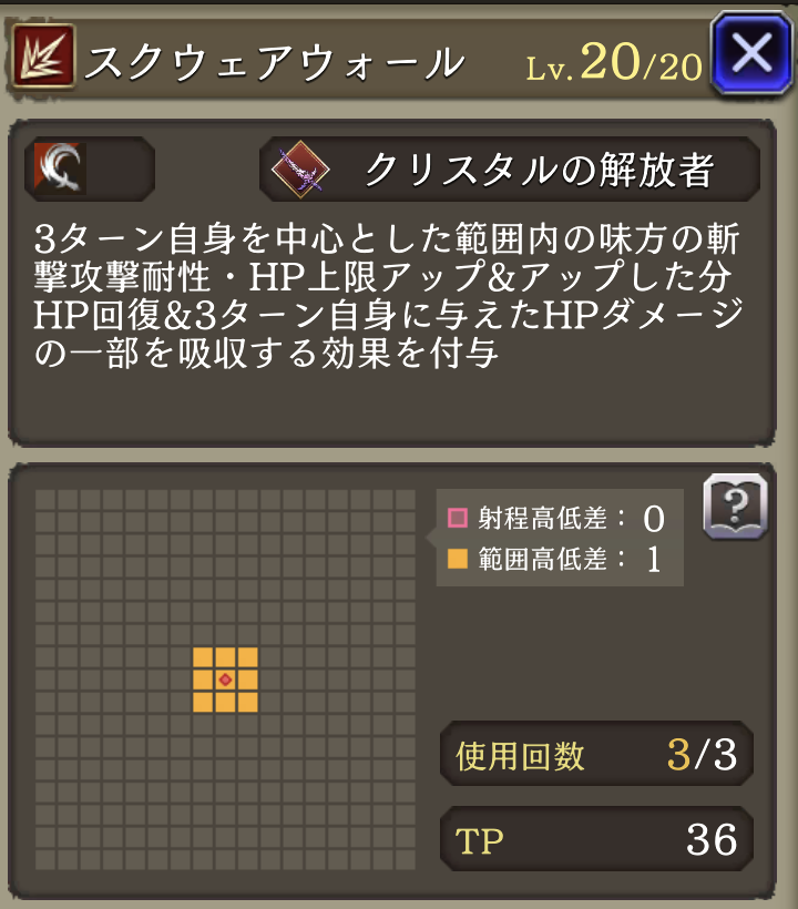 | ⇩MA3強化⇩ 味方の水属性ユニットのHP上限+10%・水属性アビリティ攻撃+15 自身のHP上限+10%、範囲攻撃耐性+10、斬撃攻撃貫通率+30、追加効果(ガッツ効果中なら物理被ダメ軽減貫通+40、全属性耐性+15を)付与 |