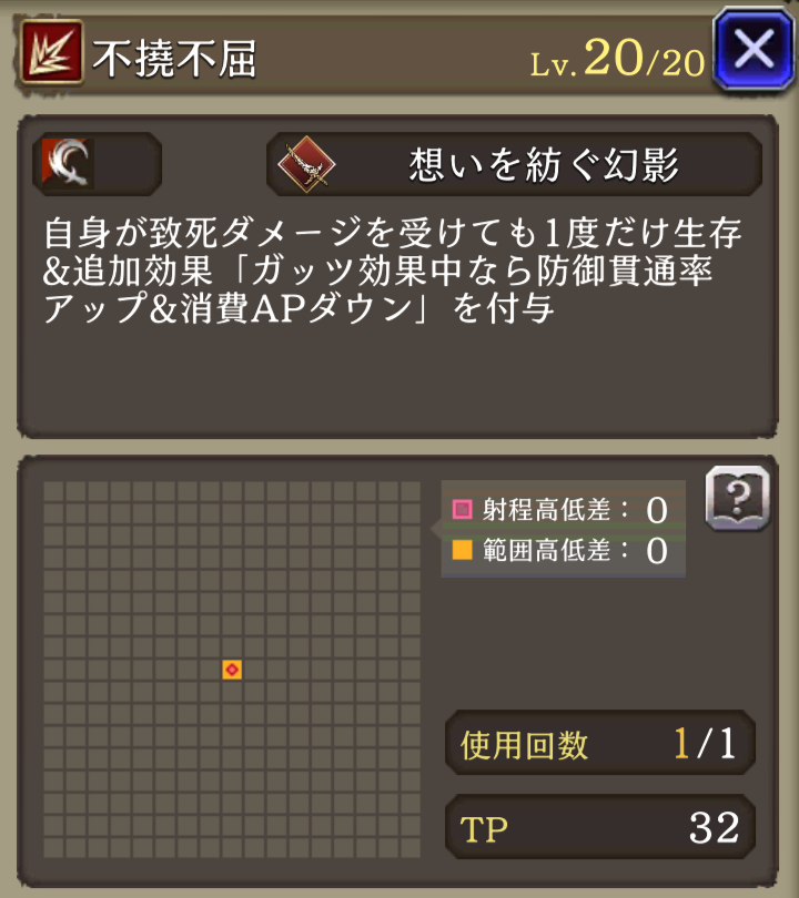 ![]() | ガッツ付与 ガッツ効果中なら 消費AP33%ダウン 防御貫通率+40 | 7 | |