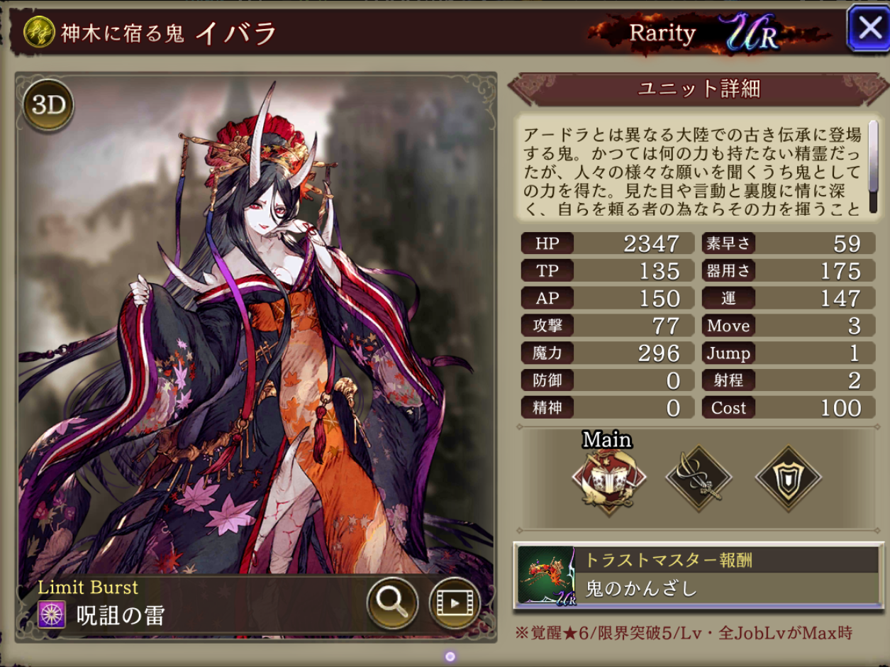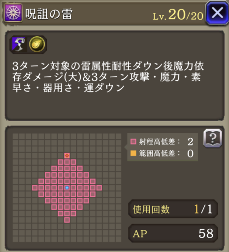 | ⇩MA3強化⇩ 味方の雷属性ユニットのHP上限+10%・雷属性アビリティ攻撃+15 自身のAP獲得補正+30%、範囲耐性+10、HP上限+20% |