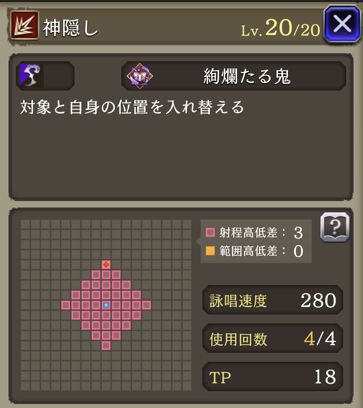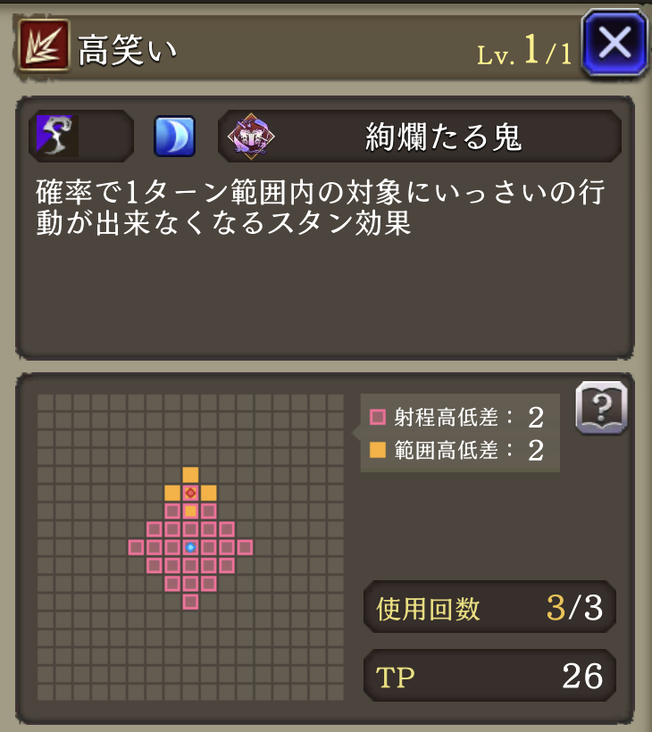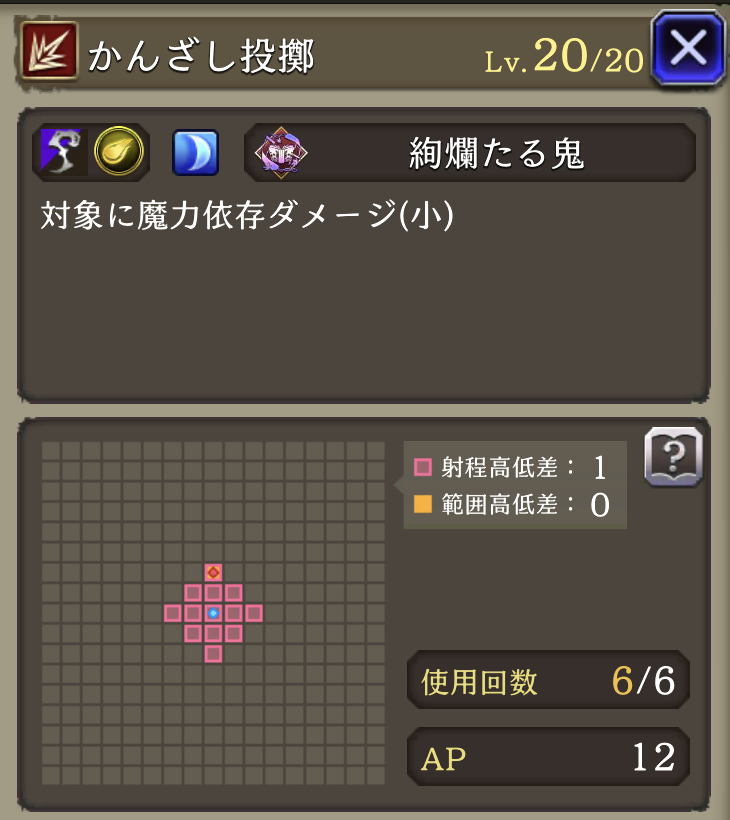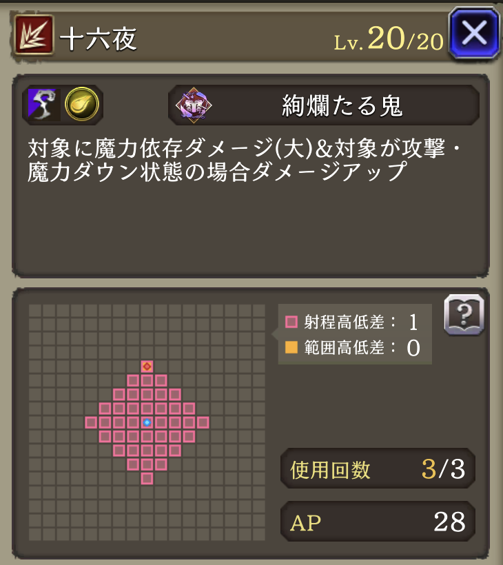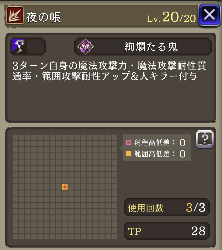 | GOOD: 耐久〇 範囲耐性での耐久が得意、物理バリア持ち&「ゾンビマスク」トラマスでリレイズも使用可 素早い サポアビで貫通あり、安定して火力を出しやすい 攻撃スキルが全て詠唱無しで使いやすい 「夜の帳」のバフが超強力!!攻防まとめて強化 バフ後の火力が凄まじい! 「プロテス・シェル」破壊攻撃可能 BAD: 単体攻撃には脆いので注意 ガッツ・リレイズを持たない 命中:ゴリゴリの回避パにはややキツイ ガッツ・リレイズ・バリア破壊に欠ける 連撃が無い |