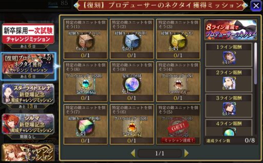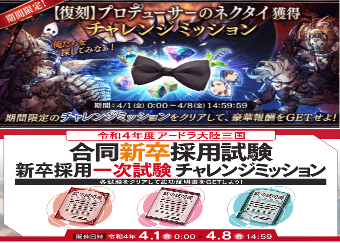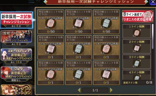 | スケルトンを50体倒す 1部10章3節Battle1 輝石の間 闇Lv5 | オーガを50体倒す 1部12章2節Battle8 輝石の間 土Lv5 | ウルフを50体倒す 2部3章1節Battle5 1部1章2節Battle1 |