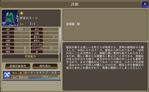 避護の衣 | 範囲耐性+15、クリティカル回避+15 |