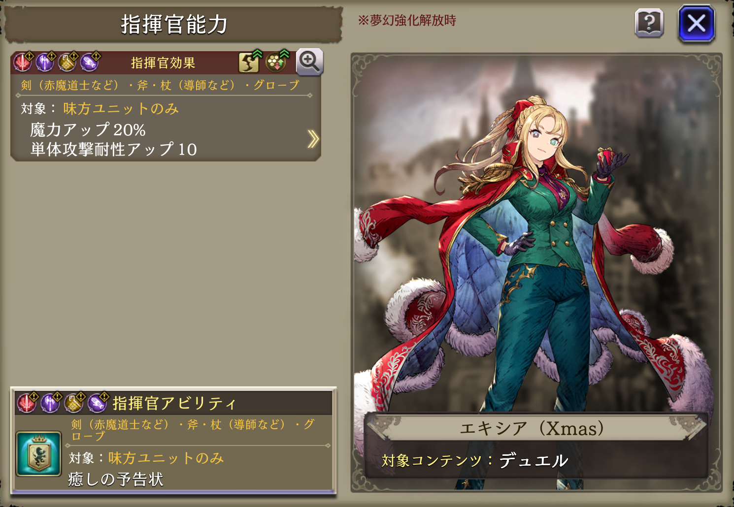 デュエル | 剣(赤) 斧 杖(導) グローブ | 癒しの予告状 1度に2回以上の被ダメ時にHP回復&全弱体解除(各ユニット3回) | 40 |