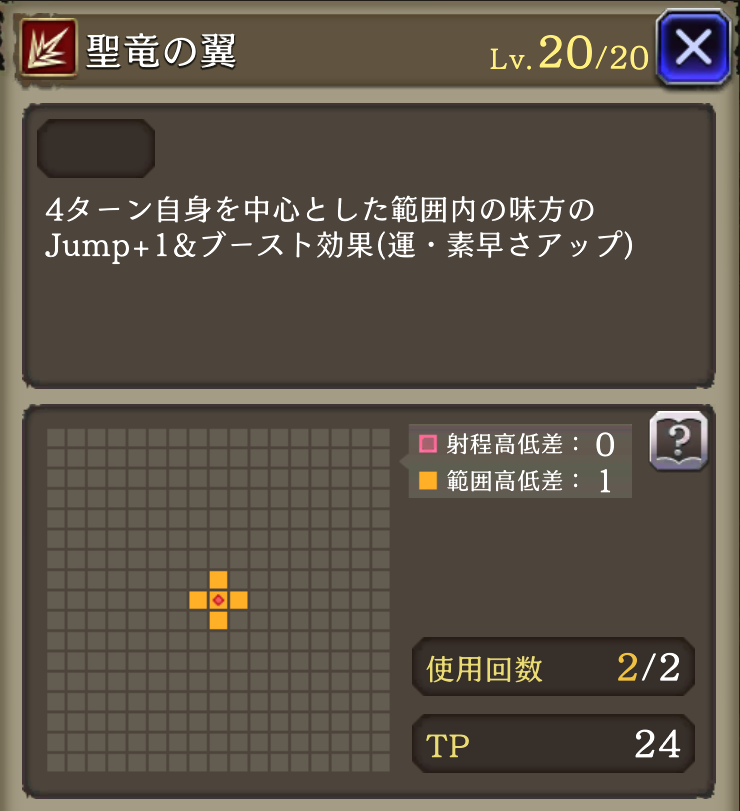 AP消費率25ダウン、命中+20 ドラゴンダイブII強化 遠い程被ダメージ軽減解除 Jump2ダウン効果追加 | 物理系 アタッカー |
