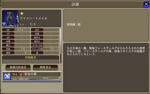 ポーション ![]() | 蒼の竜騎士 斬撃攻撃による被ダメージ時に50%の確率でHP30%回復 |