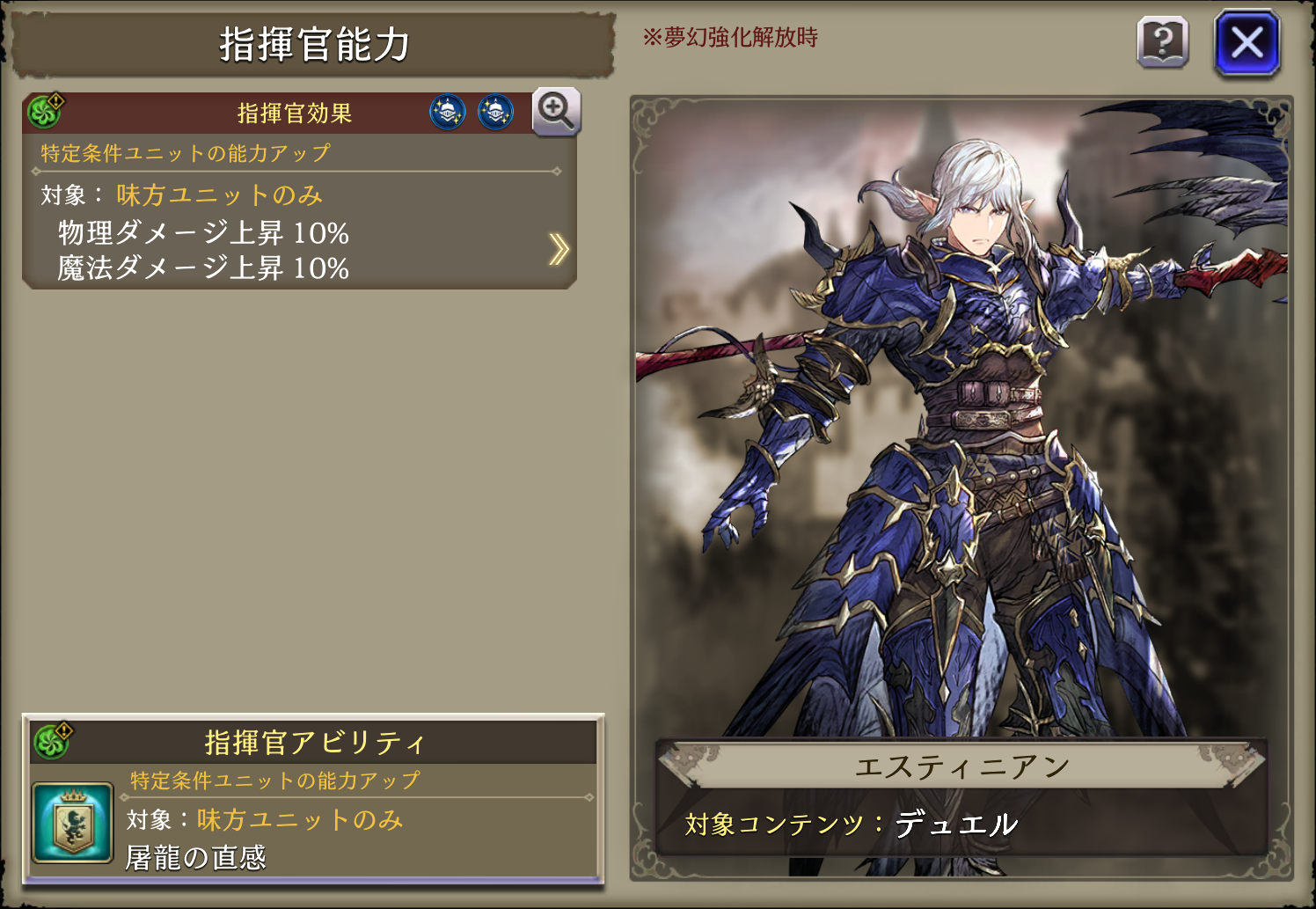 蒼の竜血 ↓ 紅の竜血 | 攻撃+24%、防御貫通+40、範囲貫通+40 ↓ 攻撃+24%、防御貫通+40、範囲貫通+40、遠い程物魔被ダメ軽減4(3~6マス)、初期AP+20 |