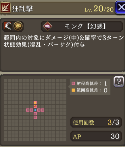 | JobLv25 狂乱撃習得 | 範囲内の対象にダメージ(中)&確率で3ターン混乱・バーサク付与 |