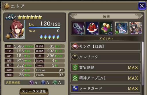 HPアップLv1 ↓ 質実剛健(EX) | HP上限+15% ↓ HP上限+15%、斬撃・刺突耐性+15 | モンク(エトア) |