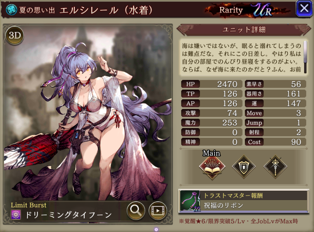 | ⇩MA3強化⇩ 味方の水属性ユニットのHP上限+10%・水属性アビリティ攻撃+15 自身の防御+10、魔力+30%、素早さ+10%、火属性耐性+15 |
