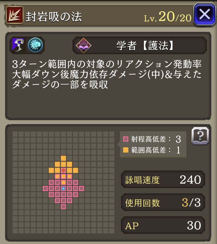 予備詠唱 ↓ 集中詠唱 | アビリティ発動時間200短縮&癒壊の法閃をバトル中のみ詠唱無しに ↓ 精神貫通率+40、アビリティ発動時間300短縮&癒壊の法閃をバトル中のみ詠唱無しに |