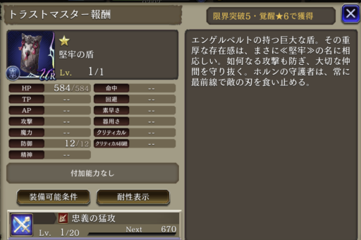 | ⇩MA3強化後 味方の光属性ユニットのHP上限+10%・光属性アビリティ攻撃+15 自身の防御+15、範囲耐性+10、ヘイト+5、セイントウォールを強化(軽減効果70%にアップ) |