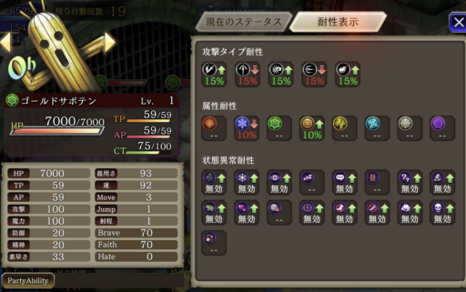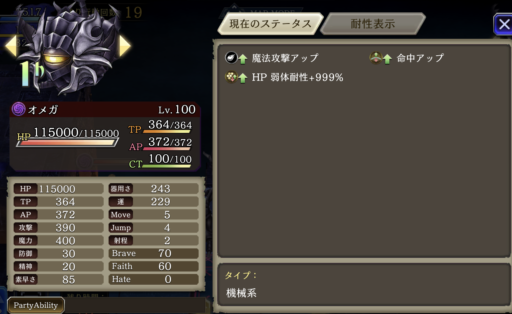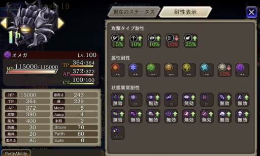 上のパーティは闇の斬撃アビリティで『チェイン』と『エレメントチェイン』を同時に狙う編成です。チェインが切れないように遅延役のジザの『時間を盗む』を使います。(ヴィネラも使えます)